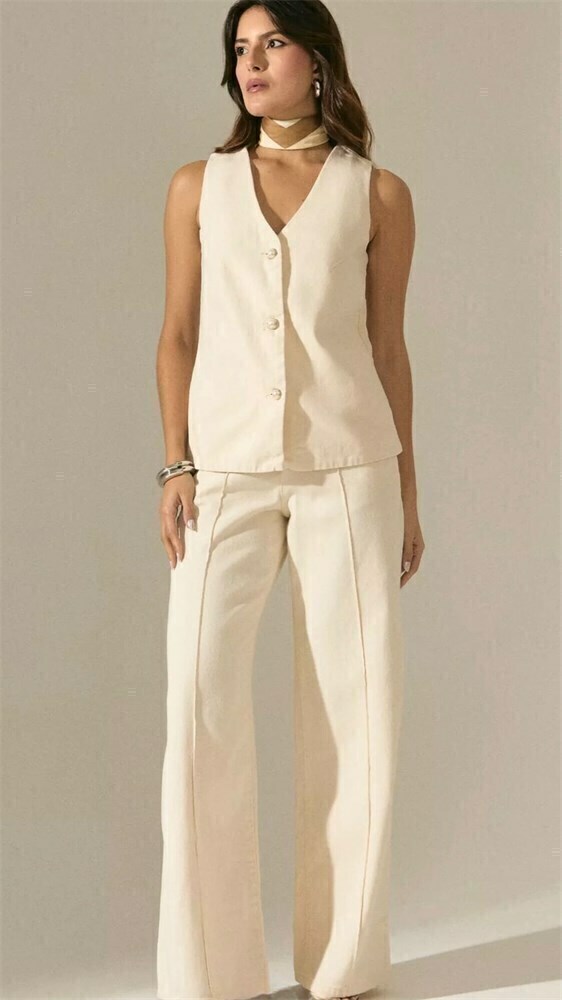 Colete Yasmin – A combinação perfeita de estilo e conforto para o seu guarda-roupa. Confeccionado em 100% algodão, o colete oferece uma textura macia e resistente, ideal para quem busca uma peça versátil e elegante.