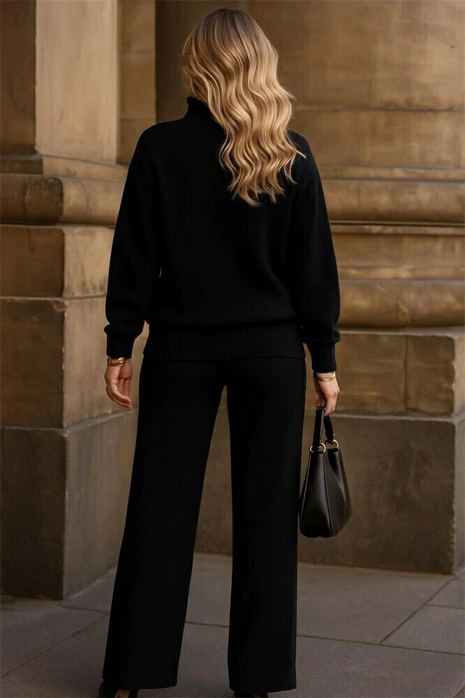 Conjunto Manu em tricô – Tamanho único, veste do 36 ao 44 com caimento impecável que valoriza diferentes silhuetas. Composto por blusa de gola alta e manga longa, e calça de modelagem reta, proporciona elegância e conforto para o dia a dia. Disponível nas cores Preto, Marrom, Doce de leite e Off-white.